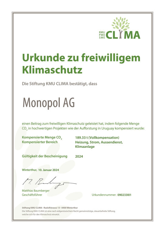 Als Gründungsmitglied von KMU Clima seit 2016 haben wir, Monopol Colors, von Anfang an die Vision einer CO2-neutralen Zukunft mitgestaltet. Unsere Reise begann kurz vor der Ratifizierung des Pariser Klimaabkommens durch die Schweiz. Mit dem Ziel, bis 2030 die Treibhausgasemissionen um 50 % im Vergleich zu 1990 zu reduzieren. Bis 2050 soll eine klimaneutrale Schweiz erreicht sein. Entsprechend haben wir uns bereits frühzeitig für den Umweltschutz engagiert. Seit 2016 setzen wir auf CO2-Teilkompensation und ab dem Jahr 2024 auf CO2-Vollkompensation.