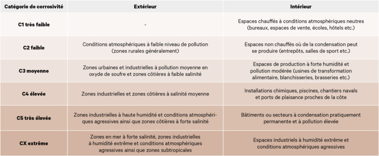 Catégories de corrosivité et exemples d’environnements-types (source: ISO 12944-2:2018):